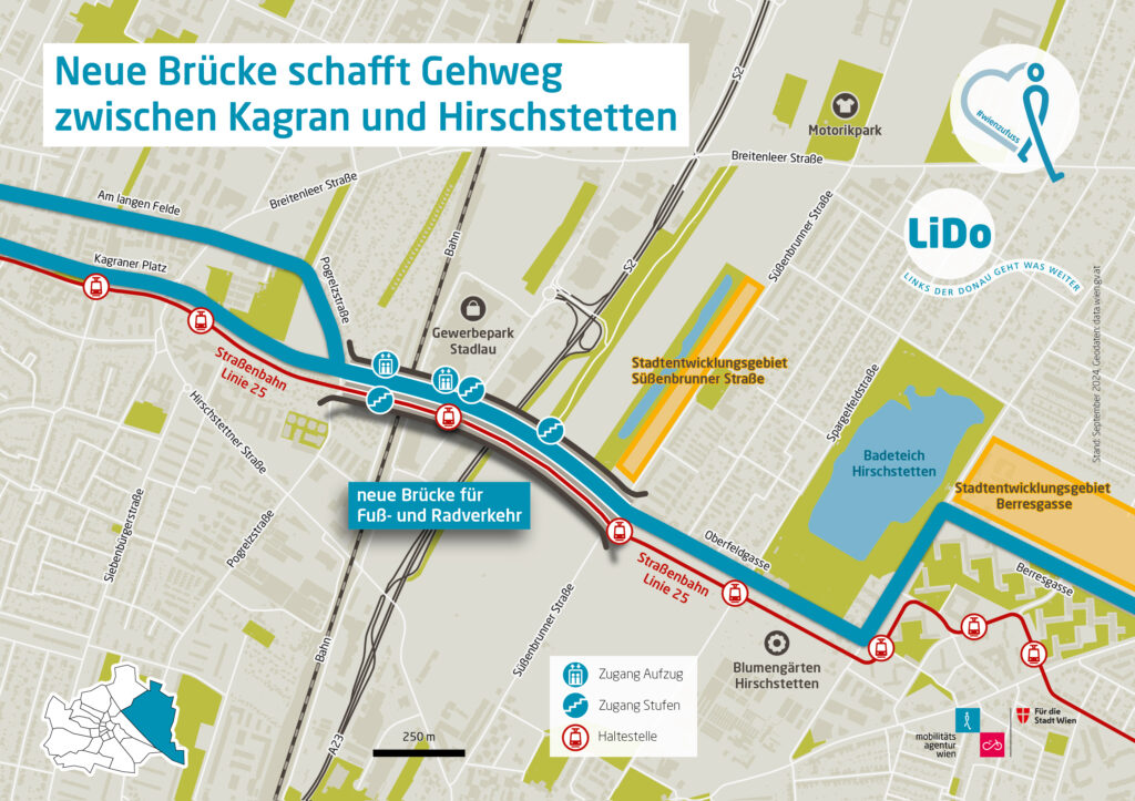 Im Zuge der Ankündigung von Kürzungen beim Wiener Budget 2026 ließ SPÖ Finanzstadträtin Barbara Novak wissen, dass Bauprojekte wie die Neuerrichtung von Brücken verschoben werden. Davon ist auch die Errichtung der Fußgänger- und Radbrücke Gewerbepark Stadlau betroffen. Bis wann der Bau dieser wichtigen Verbindung für aktive Mobilität verschoben wird, ist offen.